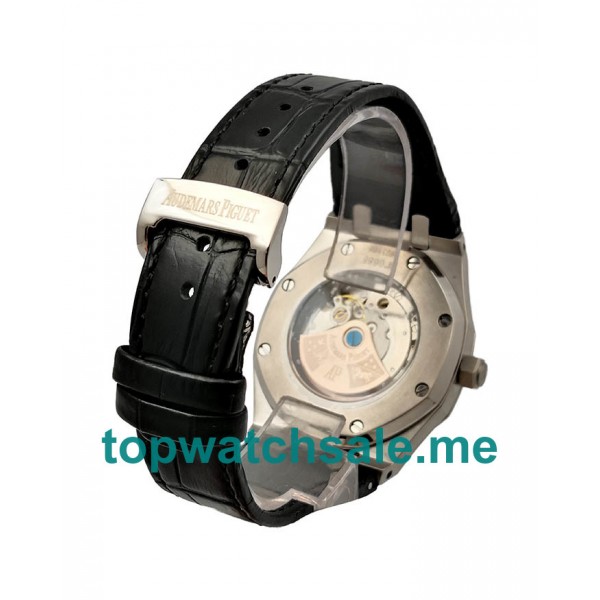 Perfect UK replica Audemars Piguet Royal Oak watches are combined with black dials and black leather straps online, and the AAA best fake watches are driven by the automatic movements for men.