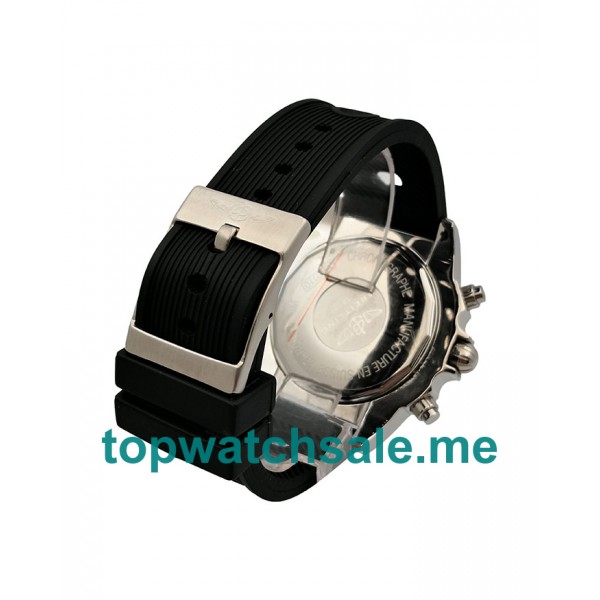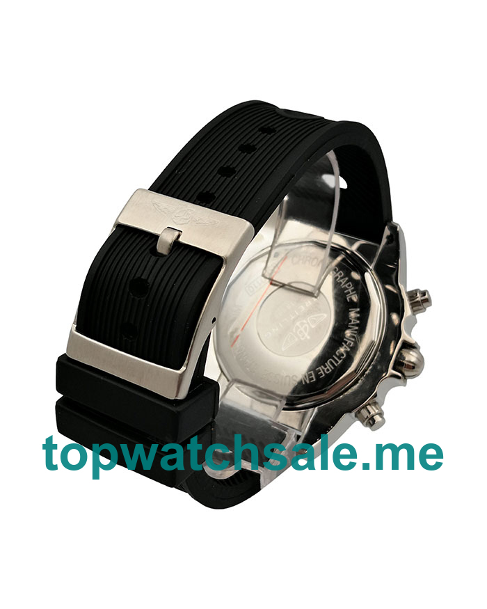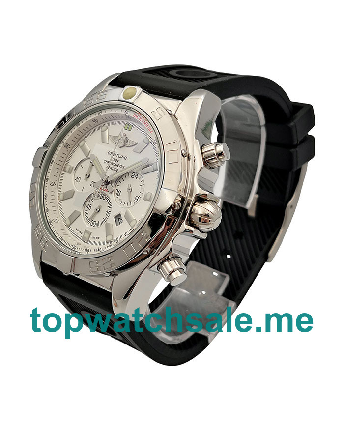 UK high quality replica Breitling Chronomat Evolution watches are equipped with quartz movements for men, and the AAA wholesale fake watches are featured with white dials and black rubber straps.