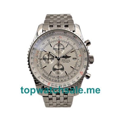 The diameter is 47 mm. The polished stainless steel replica Breitling Navitimer A23322 watches for men can guarantee water resistance to 100 meters. Besides, equipped with Swiss movements, the high-quality fake Breitling watches with white dials feature remarkable indexes and hands, date windows at 3 oclock and three silvery chronograph sub-dials.