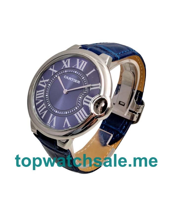 Best AAA replica Cartier Ballon Bleu watches are fashionable with blue dials and blue leather straps, and the UK wholesale fake watches are high quality with steel cases.