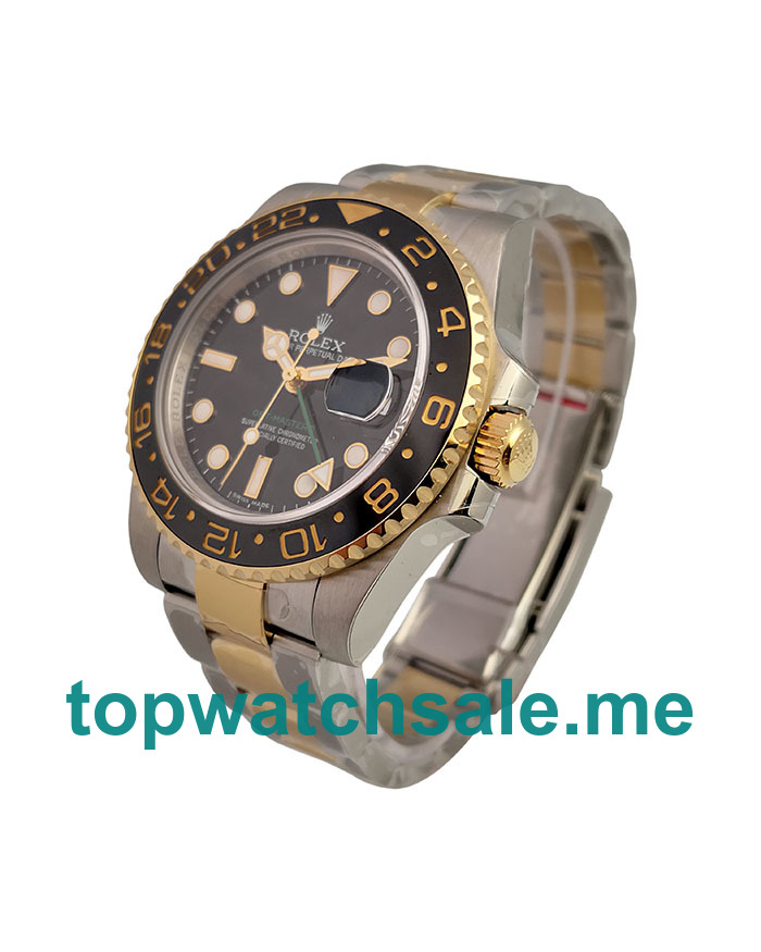 Buy UK luxury replica Rolex GMT-Master II watches with steel and gold cases and bracelets, and the top Swiss fake watches wholesale present men black dials.