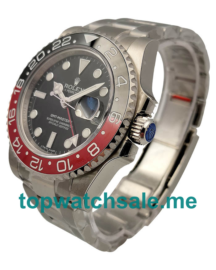 Perfect UK replica Rolex GMT-Master II watches wholesale are made up of steel cases and steel bracelets, and the top Swiss made fake watches are featured with black and red bezels.