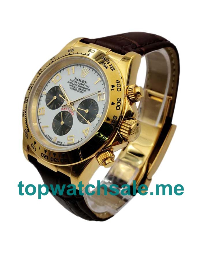 Perfect AAA replica Rolex Daytona watches UK are featured with white dials and brown leather straps, and the high quality fake watches for men are produced with gold cases online.
