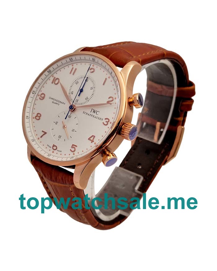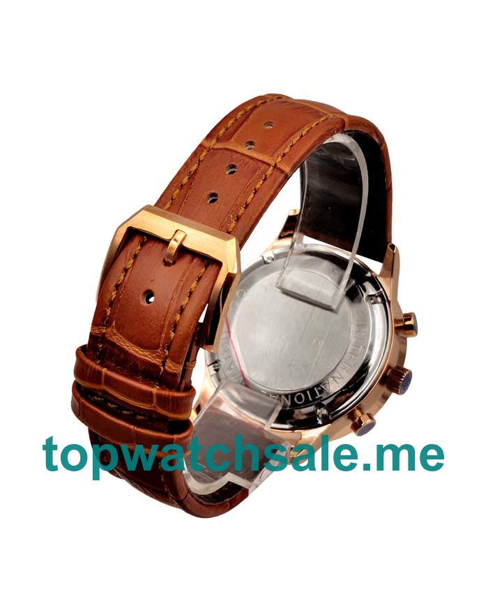 Luxury online replica IWC Portugieser watches are attractive with rose gold cases and brown leather straps, and the AAA UK fake watches are clear with rose gold hands and Arabic numerals on the white dials.