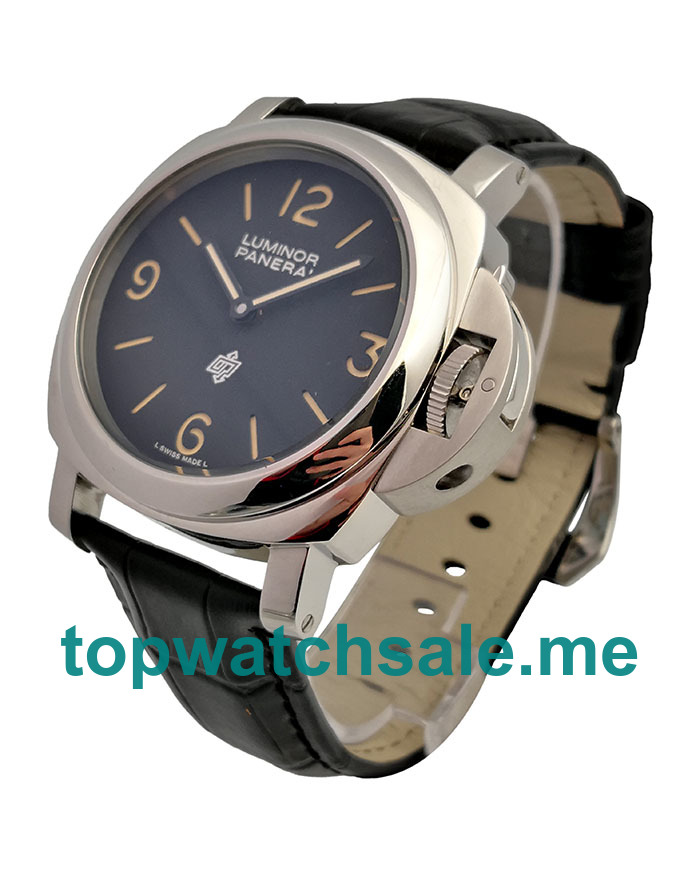 The 43 mm best fake Panerai Luminor PAM01086 watches for men are made from polished stainless steel. Together, they have black alligator leather straps and black dials with luminant hour marks and hour and minute hands.